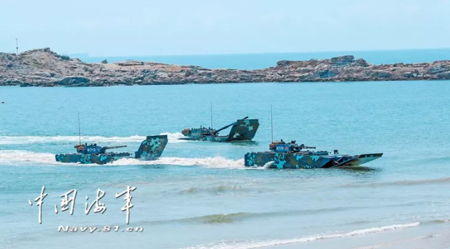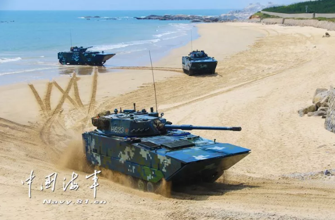 作戰(zhàn)課目演示中,兩棲裝甲車從海上發(fā)起沖擊,泛水抵灘后迅速鎖定目標,大口徑突擊炮、車載機槍連番開火,遠方的靶標紛紛應聲而落。